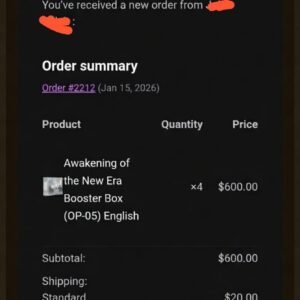 Fantastic buying experience with Tokyo TCG Warehouse! My OP-05 Awakening of the New Era booster boxes were secured smoothly and the whole process was very professional. Great communication and trustworthy service. I’ll definitely be ordering again!” — John, USA 🇺🇸